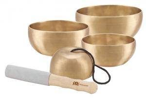 Ensemble de 4 bols tibétains UNIVERSAL : SBU400, SBU500, SBU600, SBC250. Livré avec la mailloche de résonance bois et cuir (SBRMLE), les cercles de feutres (supports) et les housses pour chaque bol. Fabrication artisanale en Inde à partir d'alliage de bronze spécial.