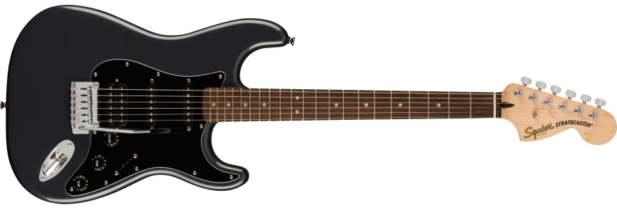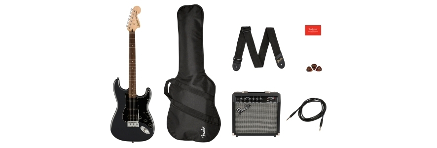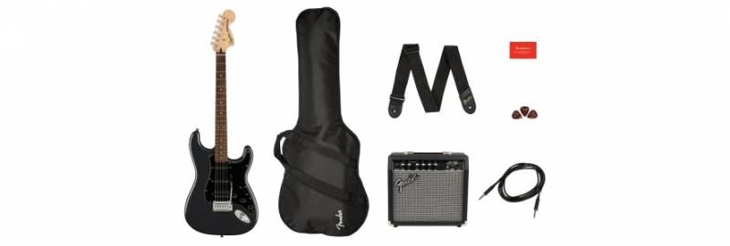 PACK SQUIER Affinity Series Stratocaster HSS comosé d' une guitare électrique Squier Stratocaster HSS LRL CFM CHARCOAL FROST METALLIC, d'un ampli Fender Frontman 15G combo (15w, 2x canaux, fiches casque et RCA pour lecteur MP3), d'un câble, d'une housse, de médiators et d'une sangle. Idéal pour débuter la guitare électrique à un prix imbattable !