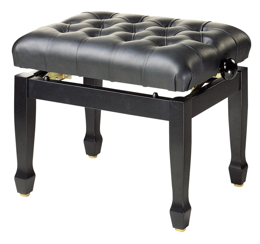 Banquette de piano de concert, couleur noir brillant, avec pelote en skaï noir anti-feu