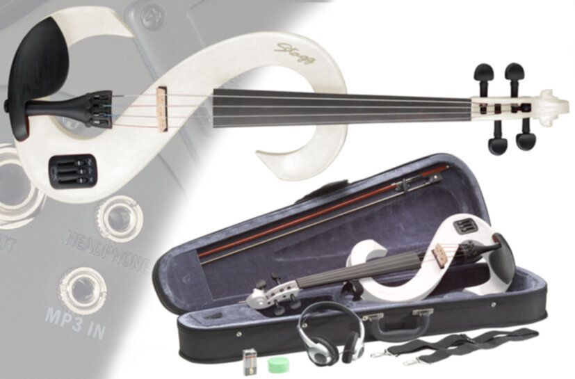 1 violon électrique en bois massif verni, pourvu de 4 réglages d'accord fin, 1 équaliseur 2-bandes & volume, 1 préampli pour casque, 1 sortie jack 6,3 mm standard, 1 sortie mini jack 3,5 mm pour casque - Diapason: 395 mm - Long. totale: 590 mm - Livré avec sangles, archet, colophane, casque stéréo, pile 9 V
