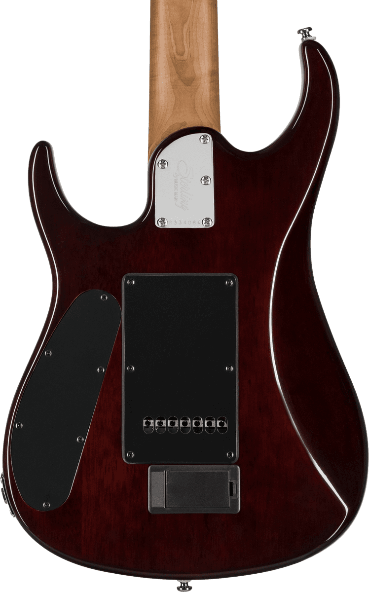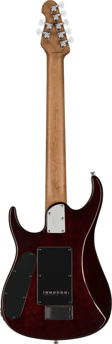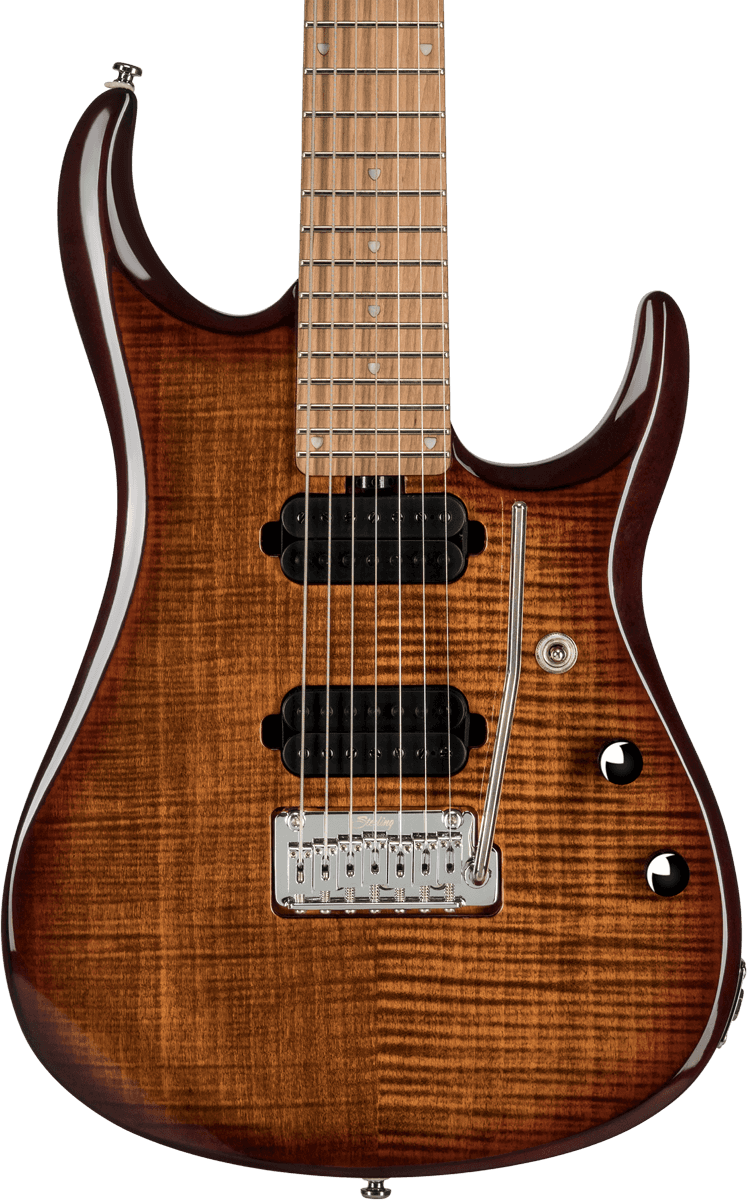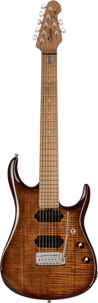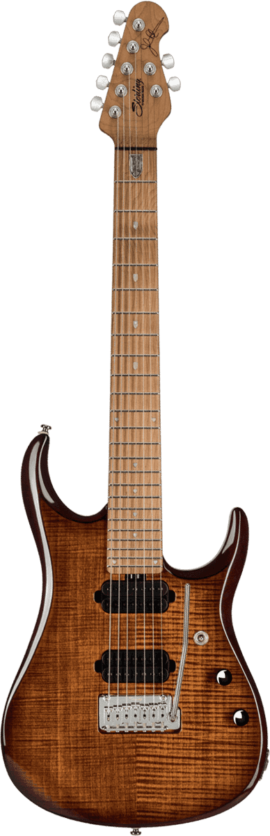 - 7 cordes - Corps : acajou - Top : érable flammé - Coloris : Island Burst - Chevalet : Modern Tremolo - Diapason : 25.5” (≈ 648 mm) - Radius : 16” (≈ 406 mm) - Frettes : 24 - medium jumbo - Largeur au sillet : 42 mm - Manche : érable massif torréfié - Touche : érable massif torréfié - Marqueurs frettes : Custom JP Inlays - Mécaniques : auto-bloquantes - Truss Rod : double action - Construction : manche vissé - Contrôles : 1 x push/push volume boost, 1 x tonalité - Switch : sélecteur 3 positions - Micros : HH - Cordes : Ernie Ball Regular Slinky 7-String (CEB 2621) - Housse : Deluxe Sterling by Music Man