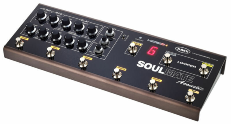 Effets classiques T-Rex et looper stéréo pour guitare acoustique Design compact Compresseur Full Band Chorus/Detune classiques chauds Delay avec Tap-Tempo Algorithmes de réverbération de haute qualité avec Shimmer Boost (post-effect) EQ 3 bandes Suppression automatique des larsens Accordeur chromatique avec détection rapide Looper stéréo (5 min.) Interrupteur On/Off avec LED de statut pour chaque effet Entrée pour pédale d'expression/volume Entrée avec gain réglable Sortie stéréo L/R Sortie stéréo symétrique sur XLR Connexion 12 DC Dimensions: 445 x 60 x 150 mm Poids: 2,1 kg Bloc d'alimentation 12 V DC incl.