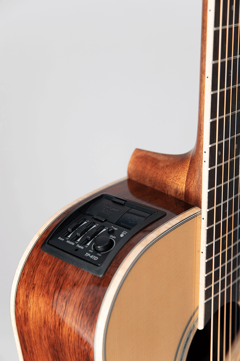 Palissandre et érable pommelé assemblés en V au milieu du dos, table en épicéa massif, finition brillante, ces guitares sont vraiment uniques.
