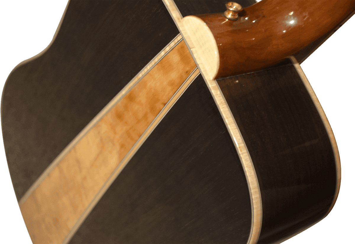 Palissandre et érable pommelé assemblés en V au milieu du dos, table en épicéa massif, finition brillante, ces guitares sont vraiment uniques.