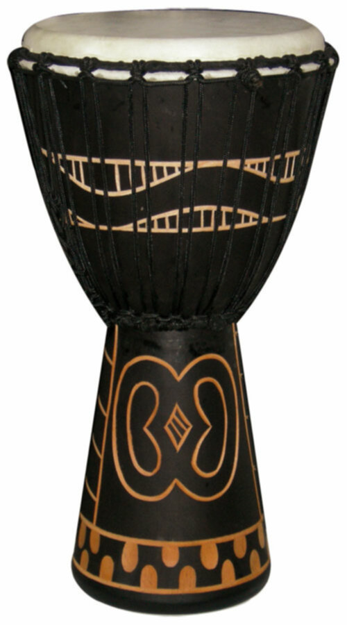 DJEMBE 12" NOIR SCULPTURE GYE NYAME Apparu en Afrique chez les Malinké en Guinée au XIIIème siècle, le djembe s'est répandu massivement depuis les années 60 dans le reste du monde. Très abordable, et accessible de 7 à 77 ans n'attendez plus pour vous mettre au djembé. En bois ou en fibre, de 8 à 14", le djembe qu'il vous faut est un Tanga. La finition des Djembés Slammer est irréprochable. Sa fabrication à la main lui fait bénéficier d'un son de qualité avec un large spectre sonore, mais également d'un esthétisme terriblement efficace. - Acajou d'Indonesie - Peau de chèvre - Tension avec cordage traditionnel - Poignée de transport intégrée au cordage