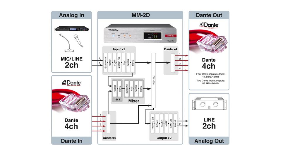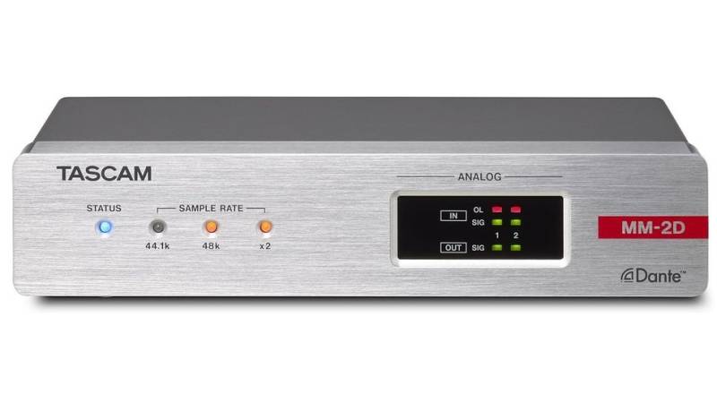 L’MM-2D fait partie de la gamme de processeurs Dante compacts Tascam, qui regroupe plusieurs convertisseurs audio demi-largeur de rack pour réseaux Dante/AES67. Ce modèle permet d’ajouter facilement des signaux d’entrée/sortie micro/ligne ou AES/EBU aux réseaux audio Dante dans des bâtiments publics, des structures de broadcast, des studios d’enregistrement ou des environnements domestiques haut de gamme, et il se greffe sans problème aux installations existantes.