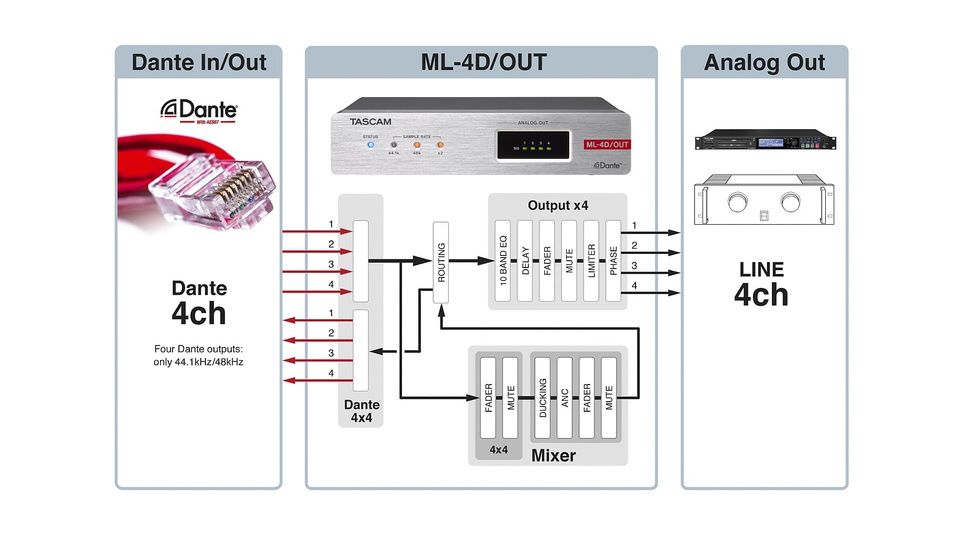 Tascam MM-4D/IN-X Convertisseur analogique-Dante-analogique 4 canaux XLR