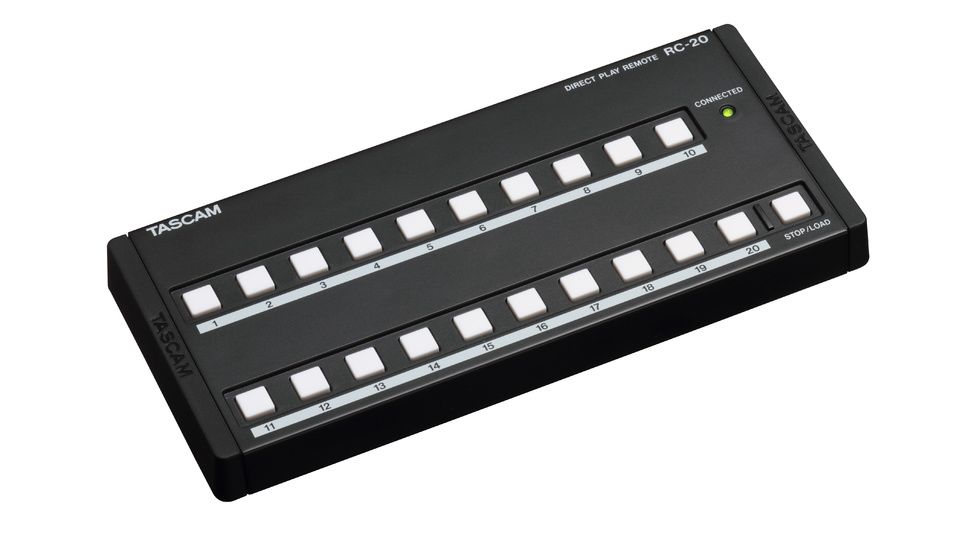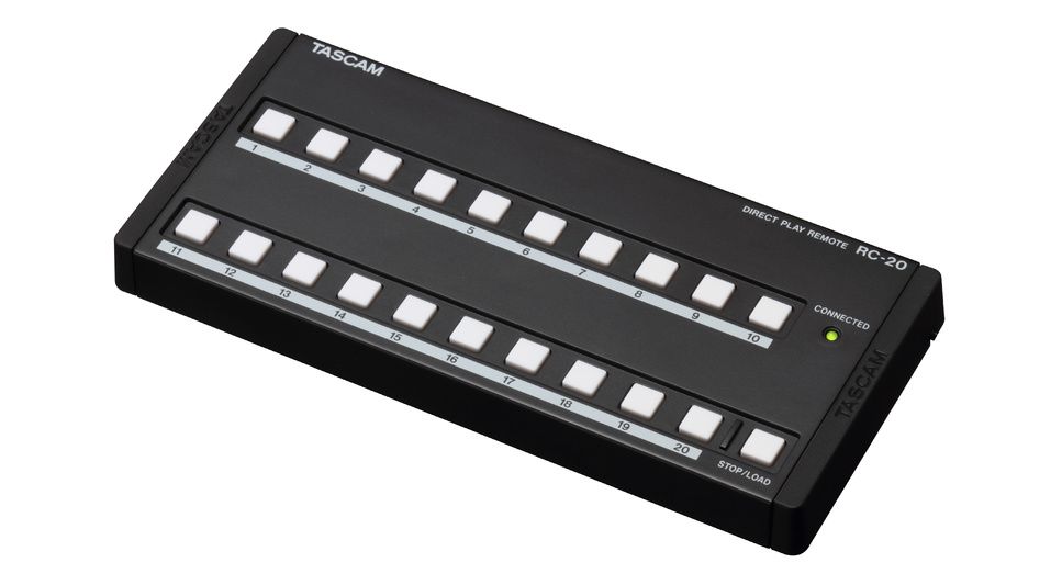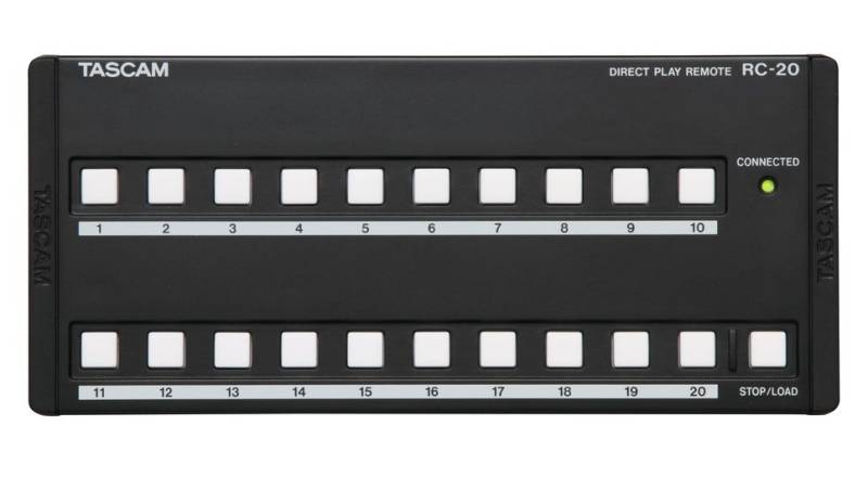 La RC-20 est une télécommande pour lecture directe destinée aux lecteurs de CD Tascam CD-500/CD-500B ainsi que d’autres appareils Tascam compatibles. Elle offre 20 grandes touches assurant l’accès direct en lecture à 20 plages, pas de programmes ou entrées de liste de lecture sur l’appareil connecté. La touche STOP/LOAD permet d’arrêter la lecture et de pré-charger les débuts des morceaux, si l’appareil connecté autorise ce mode de lecture (‘Flash Load’). La connexion s’effectue par l’intermédiaire d’un câble d’une longueur de 3,9 mètres, terminé par un connecteur mini-jack TRS de 2,5 mm de diamètre. Un indicateur s’allume lorsque la RC-20 est connectée à un appareil compatible et en reçoit sa tension d’alimentation.