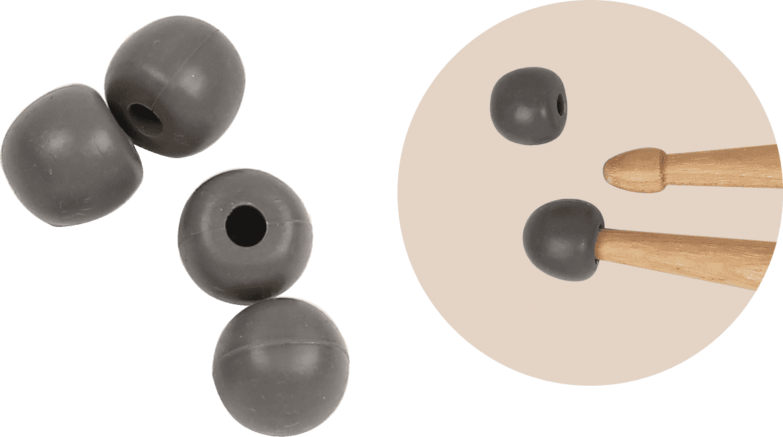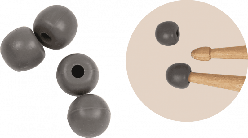En caoutchouc, ces embouts universels permettent de s'entraîner partout en silence, sur une table, un livre, etc. Ils sont aussi intéressants à jouer sur les toms et les cymbales pour trouver de nouvelles sonorités.