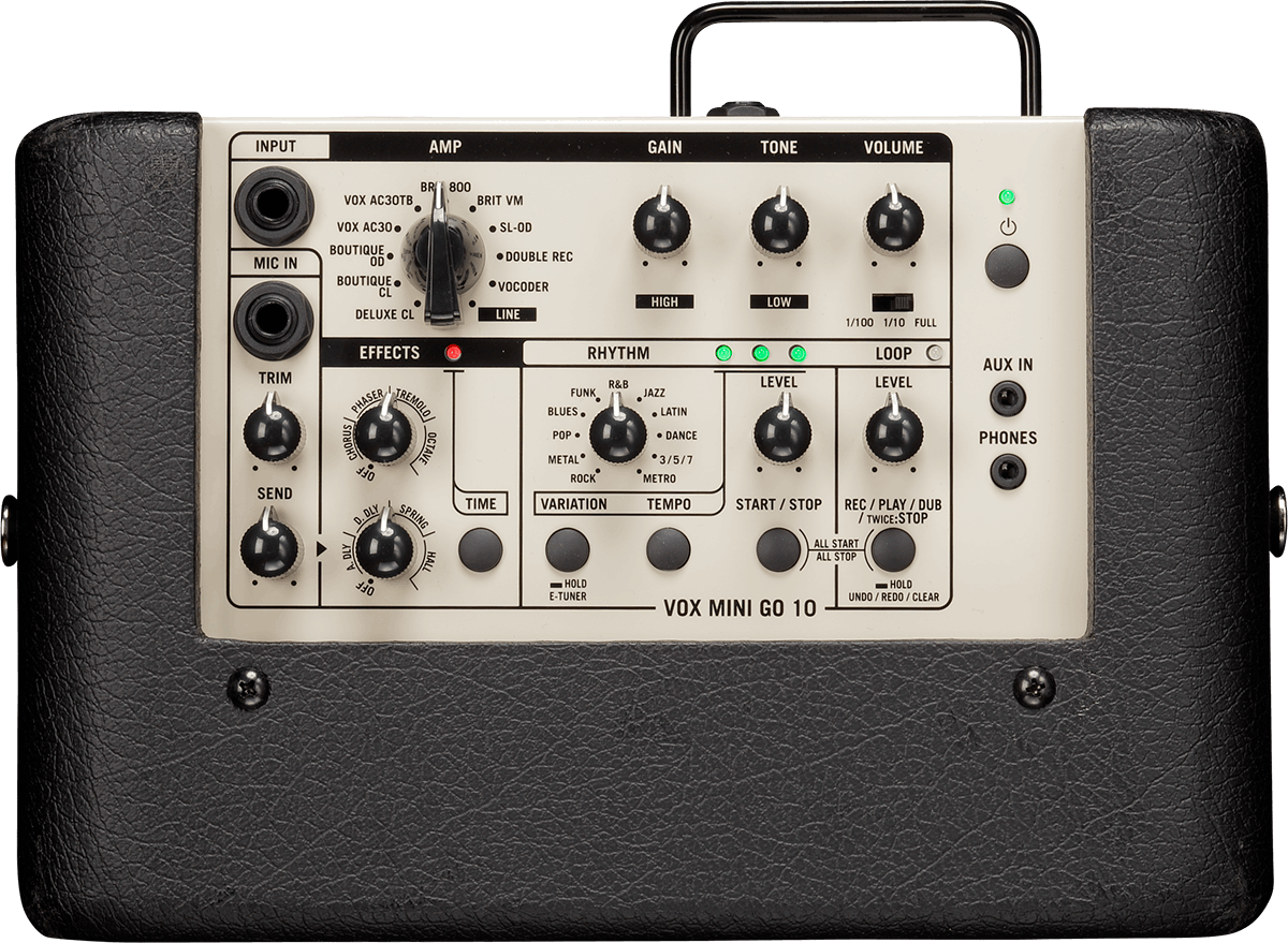 En plus de la prise jack pour guitare, les amplis VOX MINI GO disposent d'un choix complet d'entrées et sorties : une entrée micro (jack) avec volume indépendant, une entrée auxiliaire pour raccorder une source externe (smartphone, lecteur mp3…) et une sortie casque.