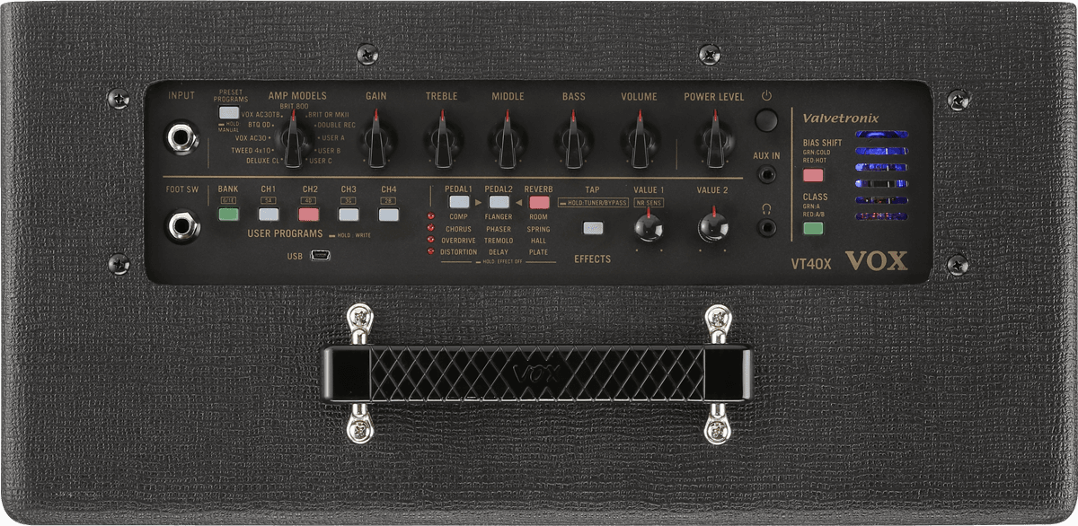 Depuis son apparition en 2001, la série Valvetronix de chez Vox a évolué en fusionnant des technologies de modélisation sophistiquées avec le circuit Valve Reactor qui simule la réponse d’un ampli à lampes. • Les simulations d’amplis gagnent en réalisme grâce au Virtual Element Technology qui reproduit les caractéristiques des composants des circuits originels. • Le préampli à lampes multi-étages Valvetronix intègre un circuit analogique qui reproduit les nuances subtiles d’un ampli tout lampes. • L’étage de puissance hybride combine un circuit analogique à un ampli de puissance numérique. Les écarts entre classe A et AB, les incidences des réglages de bias et les variations de réponse des lampes sont reproduites de façon authentique par un circuit analogique. Tous ces paramètres peuvent être ajustés selon vos préférences pour personnaliser votre son et les réactions de l’ampli. • La qualité sonore de chaque modélisation a été hautement améliorée grâce à l’optimisation des DSP (digital signal processor). • Un port USB permet d’exploiter le logiciel Vox Tone Room pour personnaliser les simulations d’amplis et d’effets. Vous pouvez stocker jusqu’à 3 effets ou simulations d’ampli dans votre VTX. La Tone Room est disponibles pour Windows, Mac et iOS (iPad, iPhone). • Pour gagner en réalisme, le caisson bass-reflex réduit la perte d’énergie au moment de la reproduction du signal et projette des basses généreuses. - Préampli : Valve Reactor avec lampe 12AX7 - Puissance : 40 Watts RMS - Haut-parleur : 1x10" @ 5 ohms - Contrôles : amp, gain, volume, aigu, médium, basse, master, power level - Modèles d'amplis : 11 types (20 avec le logiciel ToneRoom) - Effets : 13 - Programmes : 33 présets (60 avec le logiciel ToneRoom), 8 présets utilisateur - Entrées : guitare , auxiliaire, USB, footswitch - Sortie : casque - Accordeur : intégré - Pédalier : VFS5 (optionnel) - Poids & dimensions : 9,5kg - 462 x 225 x 404 mm
