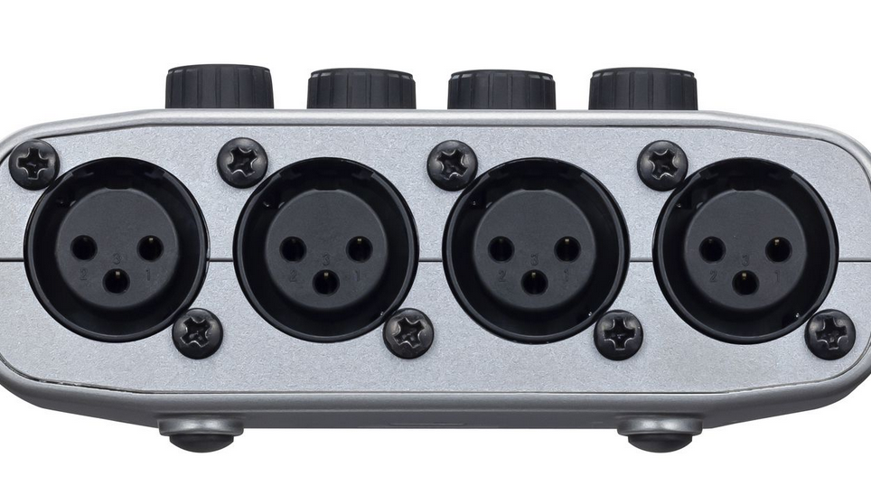 4x entrées micro avec connecteurs XLR avec alimentation fantôme, contrôle de gain et interrupteur mute