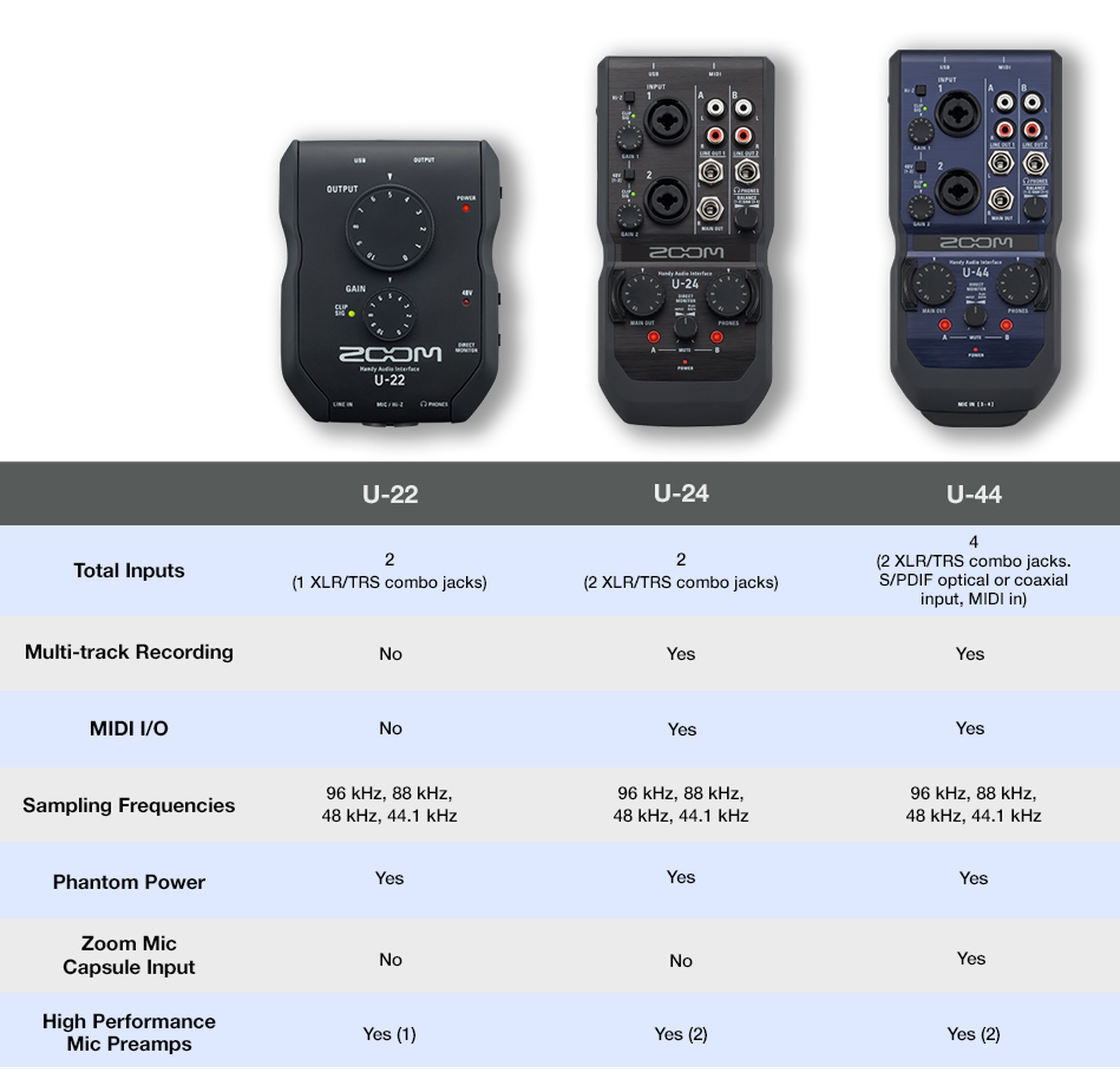 Autoalimenté sur port USB 2.0 - résolution 24 bits (44.1kHz, 48kHz, 88.2kHz, 96kHz) - 2x entrées XLR/Jack combo symétriques (avant) - switch intrument Hi-Z sur entrée 1 - alimentation fantôme +48V - 2x sorties Jack 6,35mm symétriques - 1x sortie casque Jack 6,35mm - 4x sorties analogiques RCA - entrée/sortie MIDI DIN 5 broches - monitoring direct sans latence : potentiomètre de balance entrée/playback - potentiomètre de balance préecoute casque (sorties 1-2/3-4) - compatible Windows 7 SP1 et superieur, MacOSX et iPad (via Camera Kit ou Lightning-USB non inclus) - entrée micro-B pour adaptateur secteur optionnel DC 5V/1A (AD-17) - fonctionne sur 2x piles AA - livré avec manuel utilisateur et câble USB - Logiciel Ableton Live Lite - Poids : 285g - Dimensions (mm) : 92,3 (L) x 191,8 (p) x 42,7 (h)